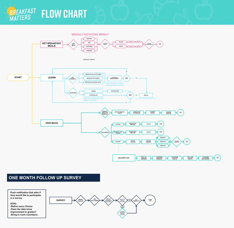 Our first idea was to create a whole education, ordering and delivery system for users to use. Where they could learn about the importance of breakfast, Order meals and have it delivered to their door. They could also volunteer to help create the meals for others. We had grandiose ideas and the project started to get out of control. There was so much to do and so little time to do it in. The idea was sound but we would not be able to deliver the experience the users need.